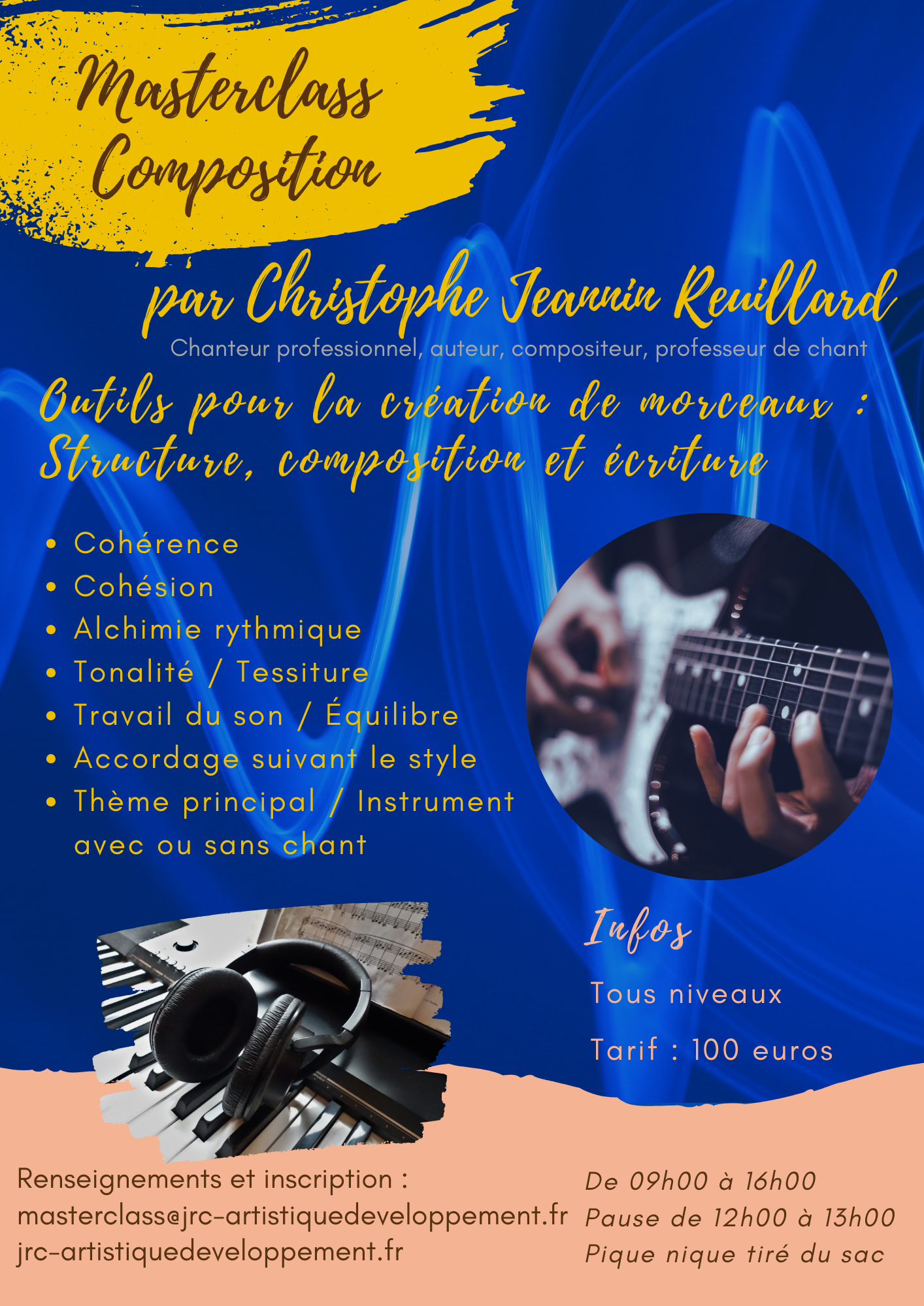 OUTILS DE CREATION DE MORCEAUX :Structure, COMPOSITION ET ECRITURE Travail sur une vision globale de la structure d’une chanson :CohérenceCohésionAlchimie rythmiqueTonalité / TessitureTravail du son / ÉquilibreAccordage suivant le styleThème principal / Instrument avec ou sans chant Pré-requis :Tous niveauxPratique d’un instrument fortement recommandée InfosDurée 6h00Pique-nique tiré du sacAfin de profiter d’échanges riches et variés, le stage n’a lieu qu’avec au minimum 5 participants Tarif100 euro / personneDéfraiement du transport et de l’hébergement le cas échéant